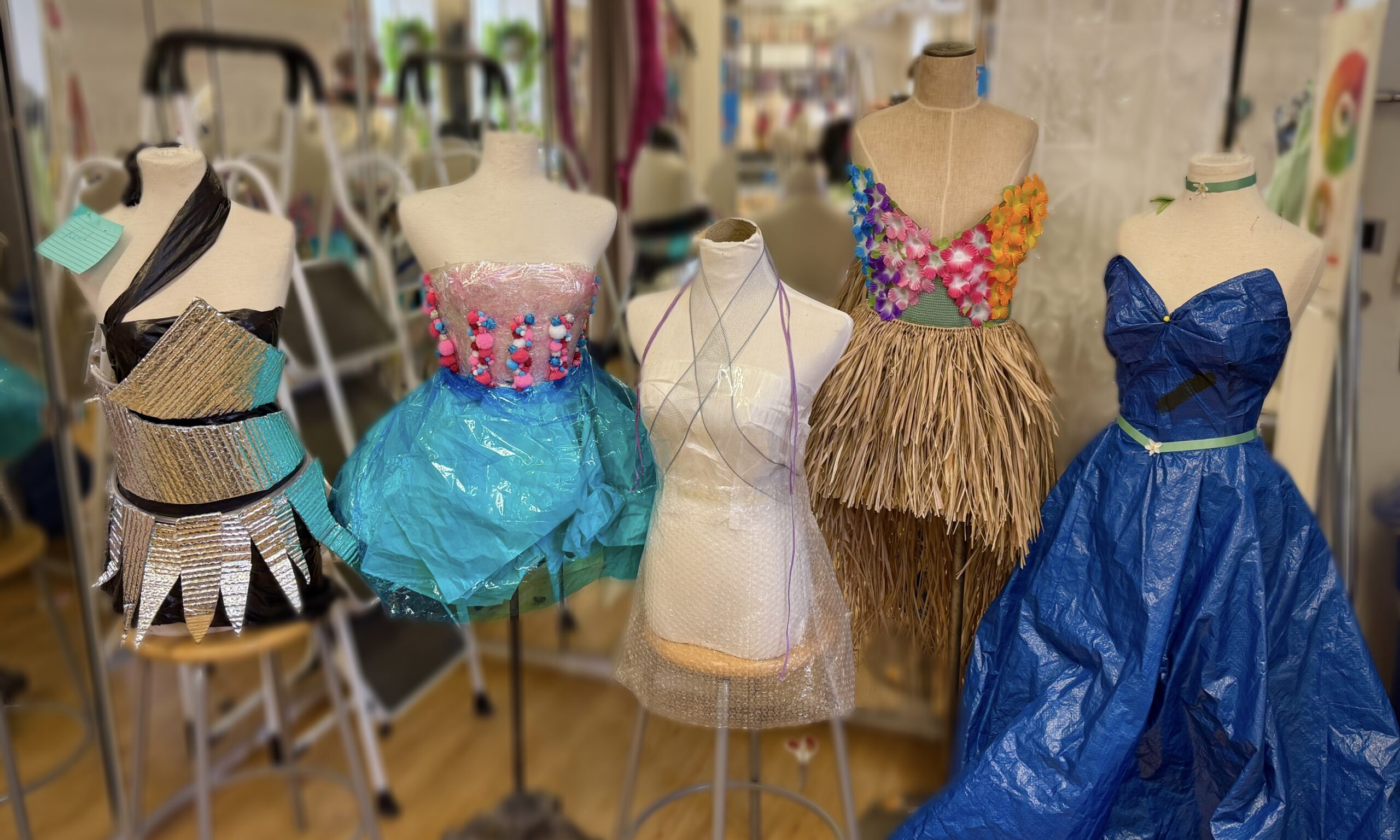 Even with unconventional materials at the center of the process, each student still found opportunities to communicate their perspective through the work. Reflective insulation material reminded one student of David Bowie, leading her to adopt a spiky, performance-inspired silhouette. Another leaned into his nature-based materials by creating a tropical look. As Margarita Zalcman ’28 shares, “I wanted to stray away from classic designs. This project is all about trying something new.”